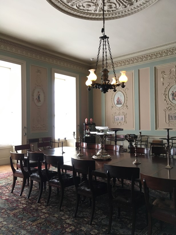 数ある部屋の中で、目を引かれたのはダイニング・ルームです。この部屋は第7代男爵によって改装され装飾はウィリアム・ウィルキンス(息子はロンドン、ナショナルギャラリーをデザイン)が担当しました。淡いピンクとブルーをベースに古代の神々のレリーフが配置されています。