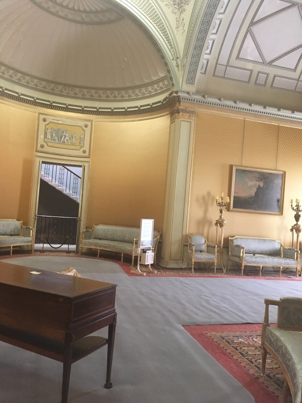 フィリップと私がローマにいたころの、あの眩しい太陽の光。ローマのあの褐色の壁が放つ陽気・・・ヴィラ マダマ(ローマ郊外の館、ラファエロがデザイン)は素晴らしかった、あのようなデザインをウィンポールの館の中に再現したい。ドームだ、ドームが要だ。ドームを真ん中にしたドローイングルーム、そして光が拡がるように、両側に袖部屋をつけよう。そして、壁は光を増幅するイエローでなくてはならない。部屋は、イエロードローイングルームと名付けよう!壁の切替しにはアラベスク模様をあしらって、あの頃発掘されたローマ様式を、再現しよう。なんて、すばらしいアイデアだ!