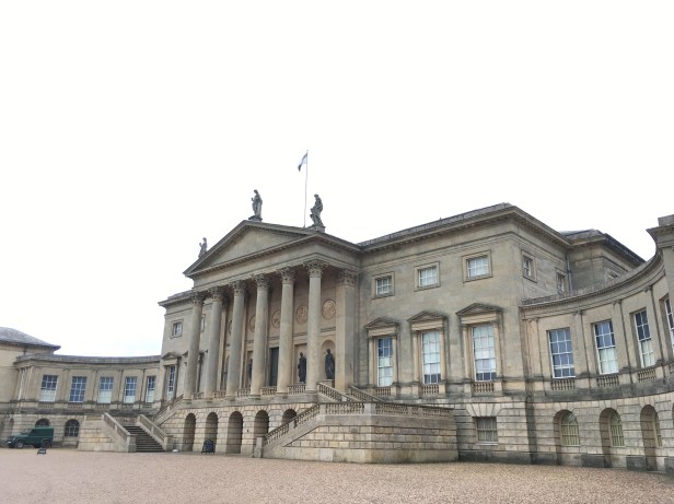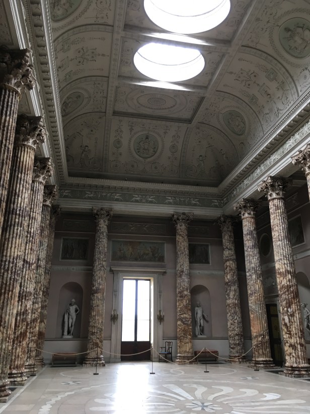 ケドルストンを訪れたのは、ダービーシャーらしい肌寒い小雨の日、パーキングから歩いていくと、ローマ神殿風のポーティコがある壮大な館が、威風堂々と緑の風景の中に、現れました。本来、お客様はパラディオ風の階段を上って、1階(日本の2階)にあるマーブルホールにまず入るのですが、現在のビジター順路は、グランドフロア―(日本の1階)の暗い入口から入り、1階(日本の2階)へと上がります。
