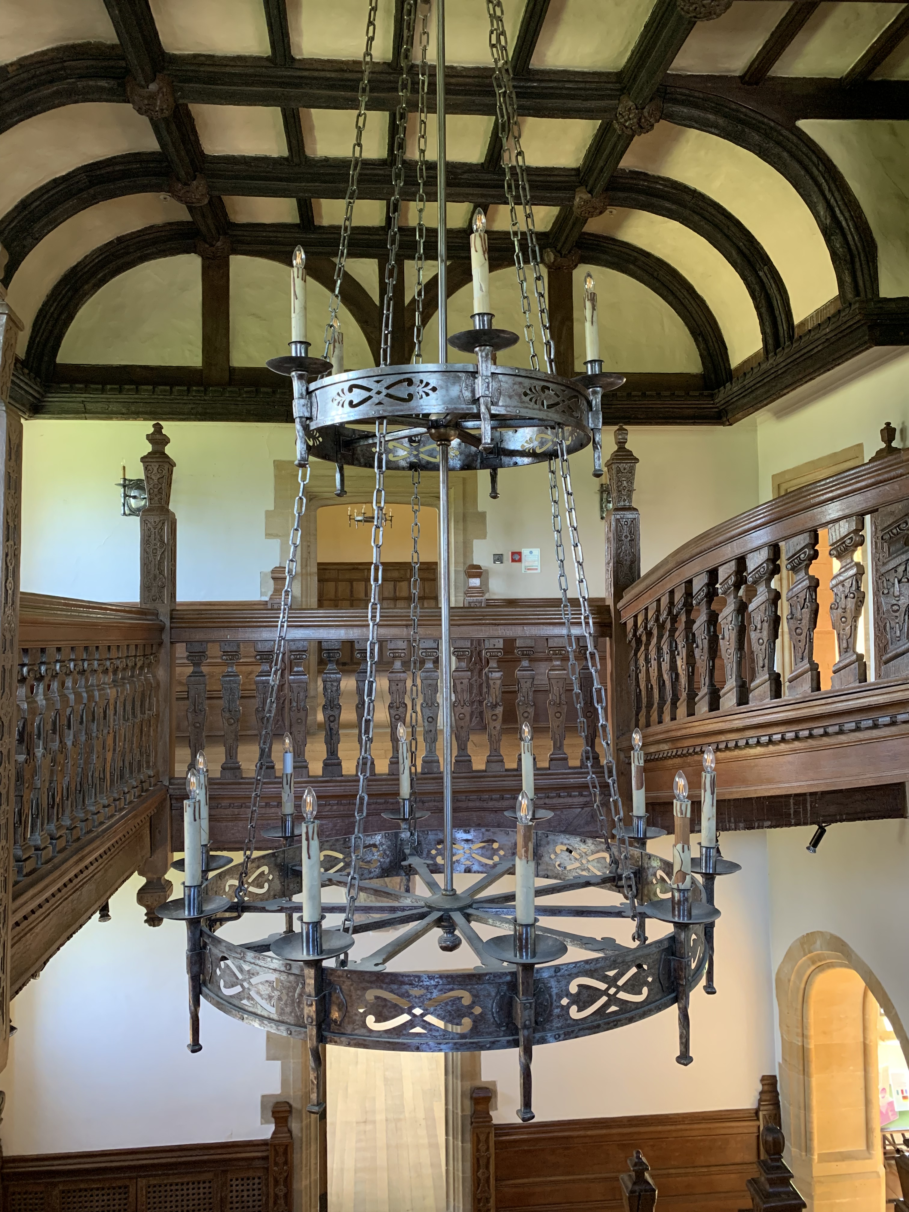 スコットランドからもってきた階段と、シンガー製の電灯シャンデリアが、見事に調和しています。この階段が、ハウスの中でもっとも迫力がありました。