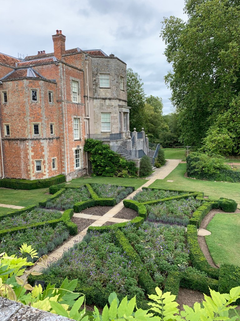 林をぬけると、ハウスの正面が現れました。中世風の石造りと、ジャコビアン風のレンガ造りがミックスされた独特のファサード。ハウスの前にある小さなノット・ガーデンが、ハウスを引き立て、こじんまりとした中にも風格のある美しさを醸し出しています。