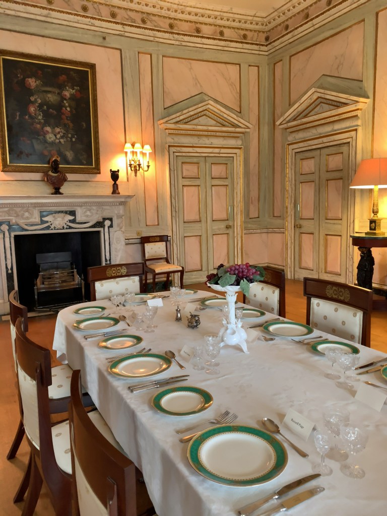 ダイニングルームの暖炉、大理石に似せたパネル飾りの色合いがすばらしい。