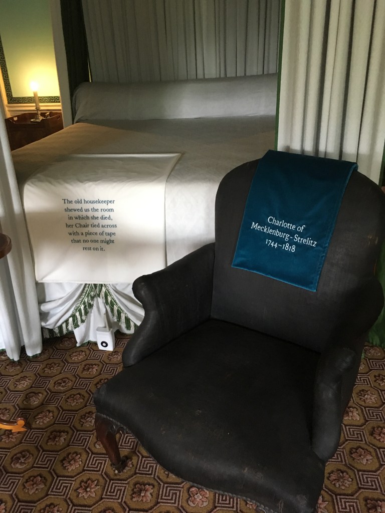 シャーロットが可愛がっていたジョージの娘、唯一王位継承権をもつ(息子たちに庶子多数あり)孫のシャーロットが1817年に21歳の若さで出産が原因で亡くなったとき(この頃出産での死亡は珍しくありませんでした)、73歳のシャーロットはあまりのショックから体調を崩してしまいます。その後、ウィンザーに向かう途中で体調が急変、キュー・パレスへ緊急搬送され、病床につきます。そして、その後回復しないまま、翌年1818年11月17日にキュー・パレスでシャーロットは亡くなります。74歳でした。