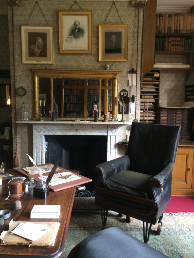 書斎は、ダーウィン当時を再現していて、多くの家具もオリジナルのものとのこと。暖炉右の書類棚は、ビーグル号の仕様を模しているそうです。ダーウィンの几帳面さが伝わってきます。