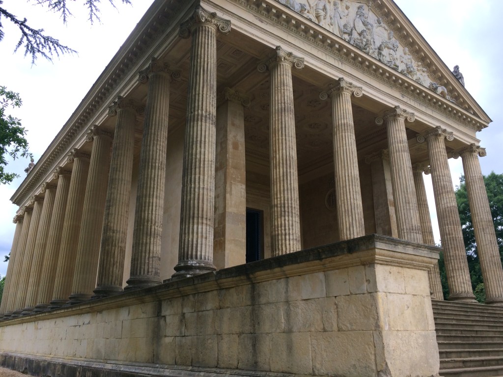 「英国式庭園」というと、自然な感じに草花が(しかし実際は、色々と工夫して)植えてある花壇が続く風景を、思い浮かべる方が多いかもしれませんが、ヨーロッパで「英国式庭園」とされるのは、湖や池、丘がある広大な土地に、幾つのもの散歩道を巡らせ、所々にギリシャ式神殿やロトンド、ローマ的凱旋門やモニュメント、ゴシック教会のミニチュア、時にはエジプト式ピラミッドなどが、細心の注意を払って、配置されている庭園で、「ランドスケープ・ガーデン」とも呼ばれます。