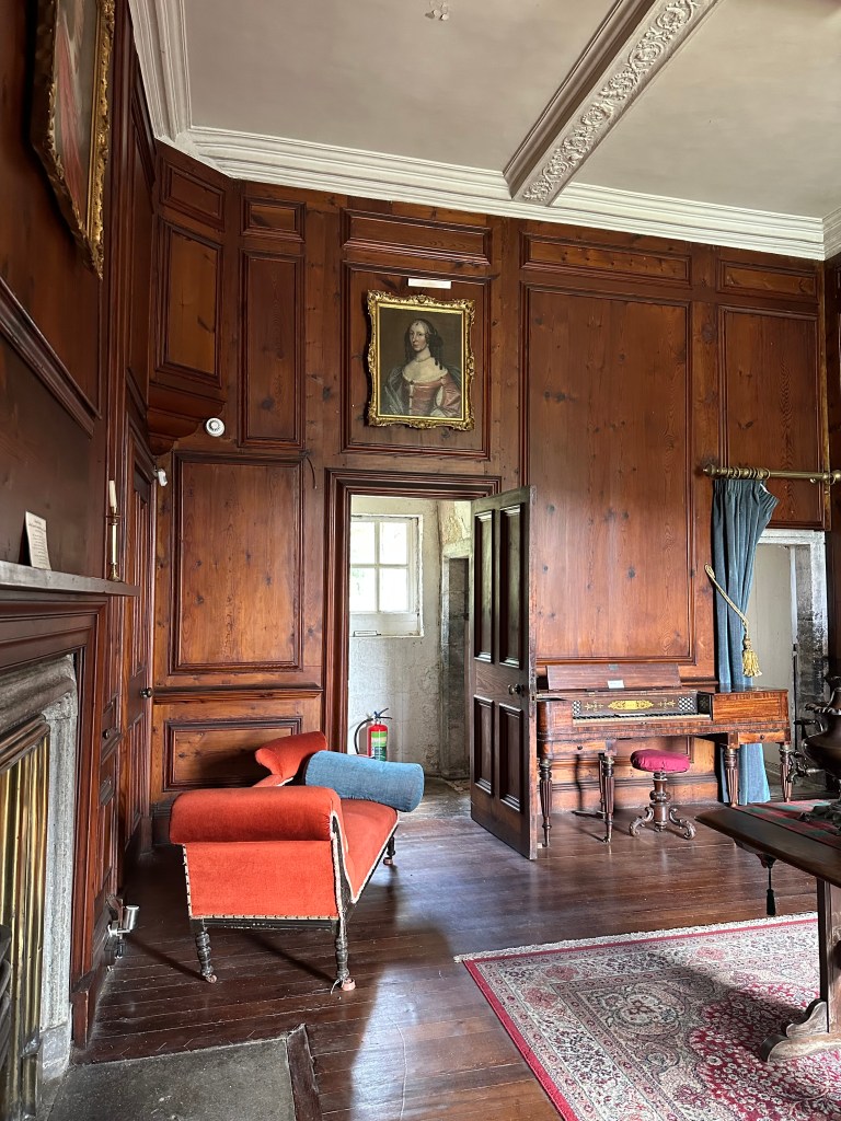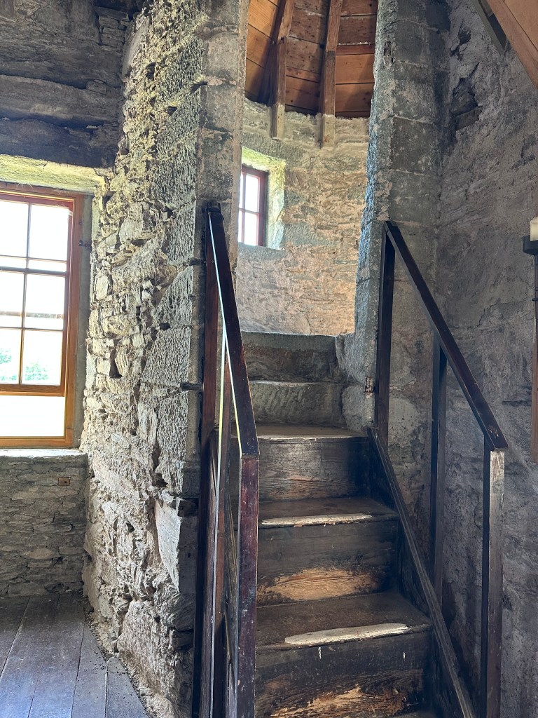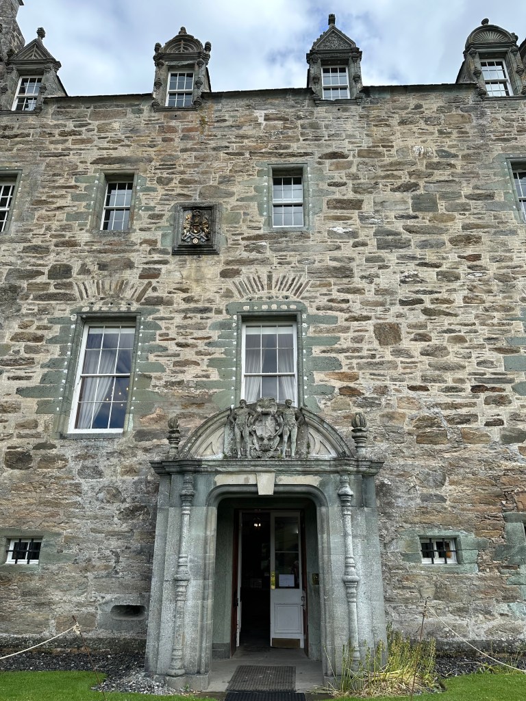 ダンケルドから山中を走って、30分ほどで到着。門はなく、『アウトランダー』のラリーブロッホを大きくしたような武骨な四角い建物が、畑の向こうに、ポツンと見えます。到着すると、1階の受付横でツアー客向けにガイドさんが説明を始めていました。ツアー客以外の訪問者は私一人のようで、ツアー客から離れて、城内をゆっくりと静かに見学することができました。