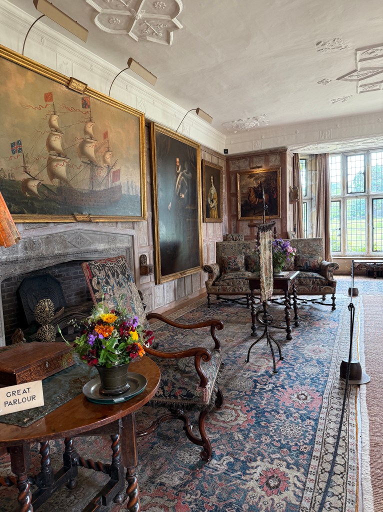 カストロによる絵画は王政復古後、懐古的に描かれたものです。「海の主権者号」や17世紀の王室肖像画が飾られているのは、内乱期に王側について大変な思いをした当主、エドワード・ビショップを偲んでいるのかもしれません。